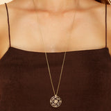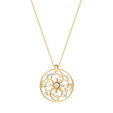 Or blanc, or jaune et diamants. Le pendentif céleste en or 14 carats symbolise la galaxie avec le soleil éclatant au centre. La lune et les étoiles en or blanc sont ornées de diamants sertis à la main.